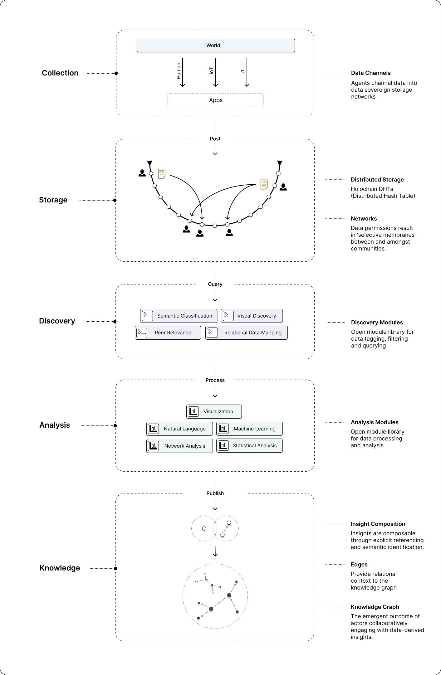 Since data-driven sensemaking is impractical without a diversity of data, methods for channelling and/or exposing data from a multitude of sources is paramount. On the one hand, this involves developing standardised, consensual methods for data collection from applications, including IoT devices, traditional web apps, and other Holochain apps: what we term ‘data channels’. Data entering the ecosystem from the ‘outside’ (i.e beyond the data-sovereign membrane) is always mediated through an agent (e.g. a human or IoT device), who submits the contents along with a record containing metadata that can be recognised and validated by other agents (see Holochain’s validation rules). In other words, we record the provenance and context associated with any data point. Since other Holochain apps are already operating within their respective data-sovereign membrane, and self-host their own data, participants in those networks may reveal relevant data to the data commons ecosystem for query. As for storing all this data, Holochain already provides us with mechanisms for distributed data storage (see Holochain’s DHT), with capacity scaling linearly with the number of peers.
