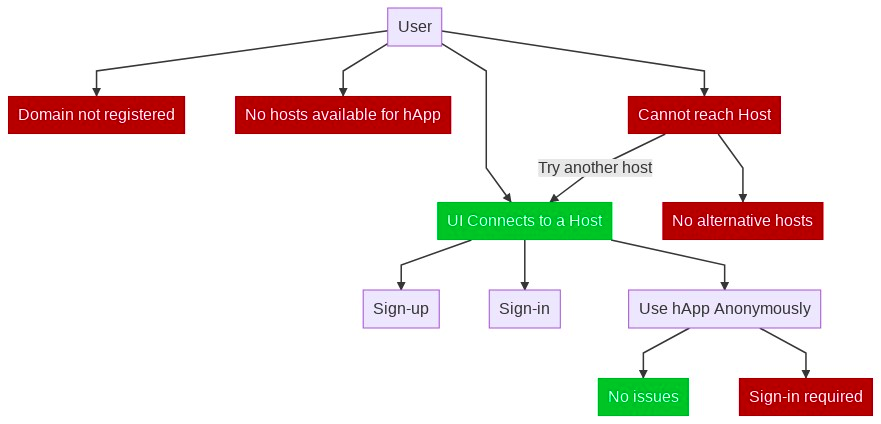 This is more complicated than the failure cases for a self-hosted hApp, where a HoloPort owner is guaranteed to have their own running instance as long as their device is turned on and connected to the internet. We have to consider the above scenarios from the user’s perspective, but we also have to consider what happens from the host’s perspective. This is because, with a Holo-hosted hApp, the user has complete control over their credentials. They’re generated in-browser from their email and password and never leave their device. That means that, for every piece of data a HoloPort stores on their behalf, it has to ask the user’s browser to sign that data. With our design, this happens asynchronously so a user may accidentally close their browser before their appointed host has had the chance to ask them to sign a particular piece of data.