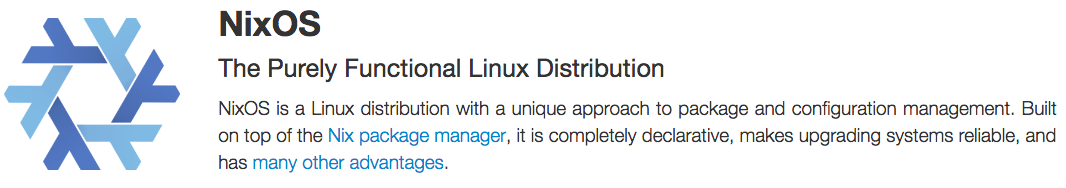 You might ask, “But what about Windows?” Rest assured, Native Windows support is under active development! In the meantime, you can use the Vagrant-based installer to install NixOS as a virtual machine. Docker is also an installation option, but it requires a Windows Pro/Enterprise/Education License.