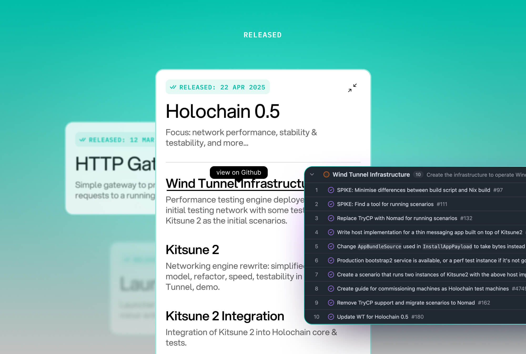 We’ve just released a new roadmap for Holochain that we redesigned to improve visibility into both the development status and the workflow of the Holochain team. It shows a summary of release history, status of in-progress work, and planning of upcoming work including releases actively being planned and those that are just incubating. These summaries are linked to our actual Github project management tooling to calculate our work velocity and expected completion of work in progress as well as planning estimation.