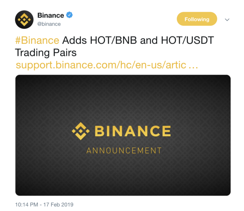 Binance Lists HOT as Their Most Recent USDT and BNB Pair — Read the Full Announcement.