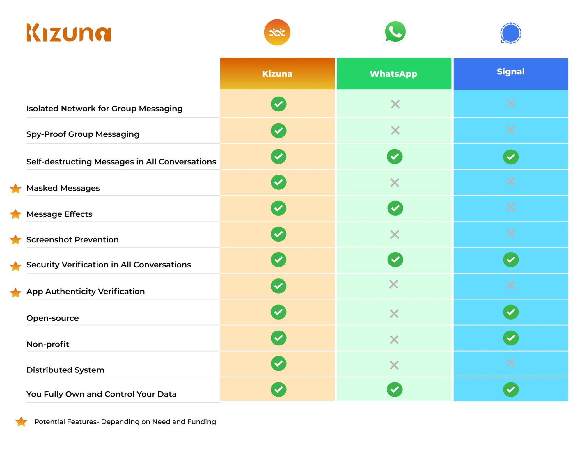 On the practical level, here’s a feature-by-feature comparison to other popular private messengers.