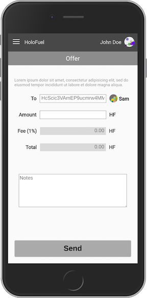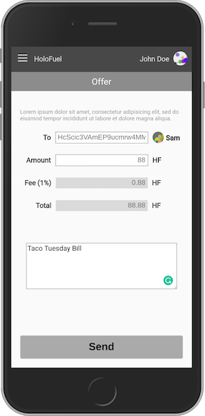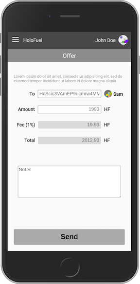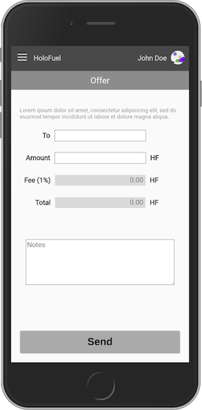 - Offer: Create an offer to send someone HoloFuel