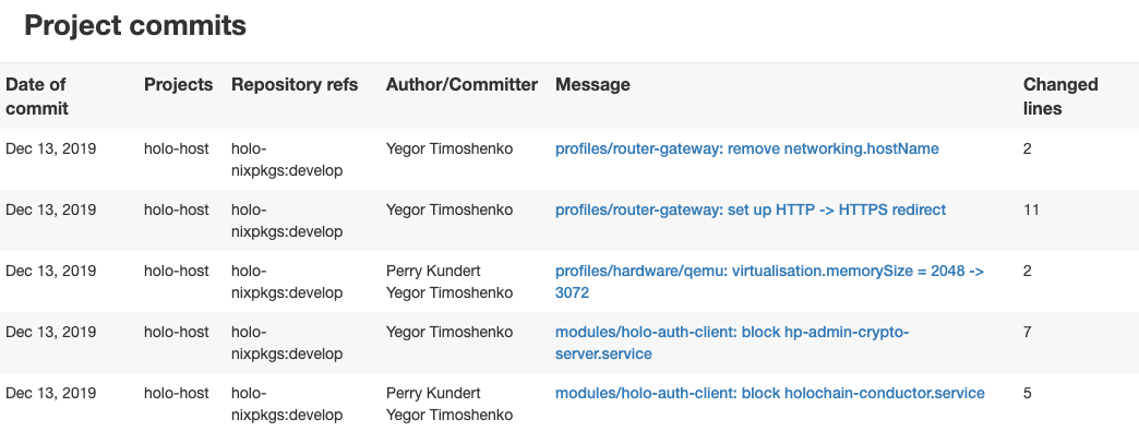 Similarly, we’ve been updating the Nix packages that Holo Hosting will draw on during the build process, which we discussed in Dev Pulse 48. We’ve enabled Holo-Router-Agent to access the HP Admin UI, and fixed a bug involving MIME type handling that caused vector images to not be displayed. We also added a new function, buildDNA, which will provide new standard files (shell.nix and default.nix) to develop DNAs that require additional components for testing or other tasks. We’ve also set up HoloPortOS so that it now defaults to the public sim2h server for testing (see our previous discussion of sim2h and why it’s important for this phase of testing).